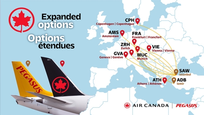 Anlaşma kapsamında Pegasus, Air Canada yolcularına Avrupa’daki önemli aktarma merkezleri üzerinden İstanbul Sabiha Gökçen Havalimanı ve İzmir Adnan Menderes Havalimanı bağlantısı sunacak. Air Canada yolcuları, Amsterdam, Frankfurt, Kopenhag, Münih, Cenevre, Viyana, Zürih ve Atina çıkışlı uçuşlarla İstanbul’a; Frankfurt aktarmalı olarak ise İzmir’e tek biletle seyahat edebilecek.